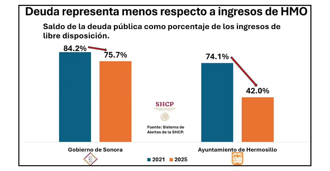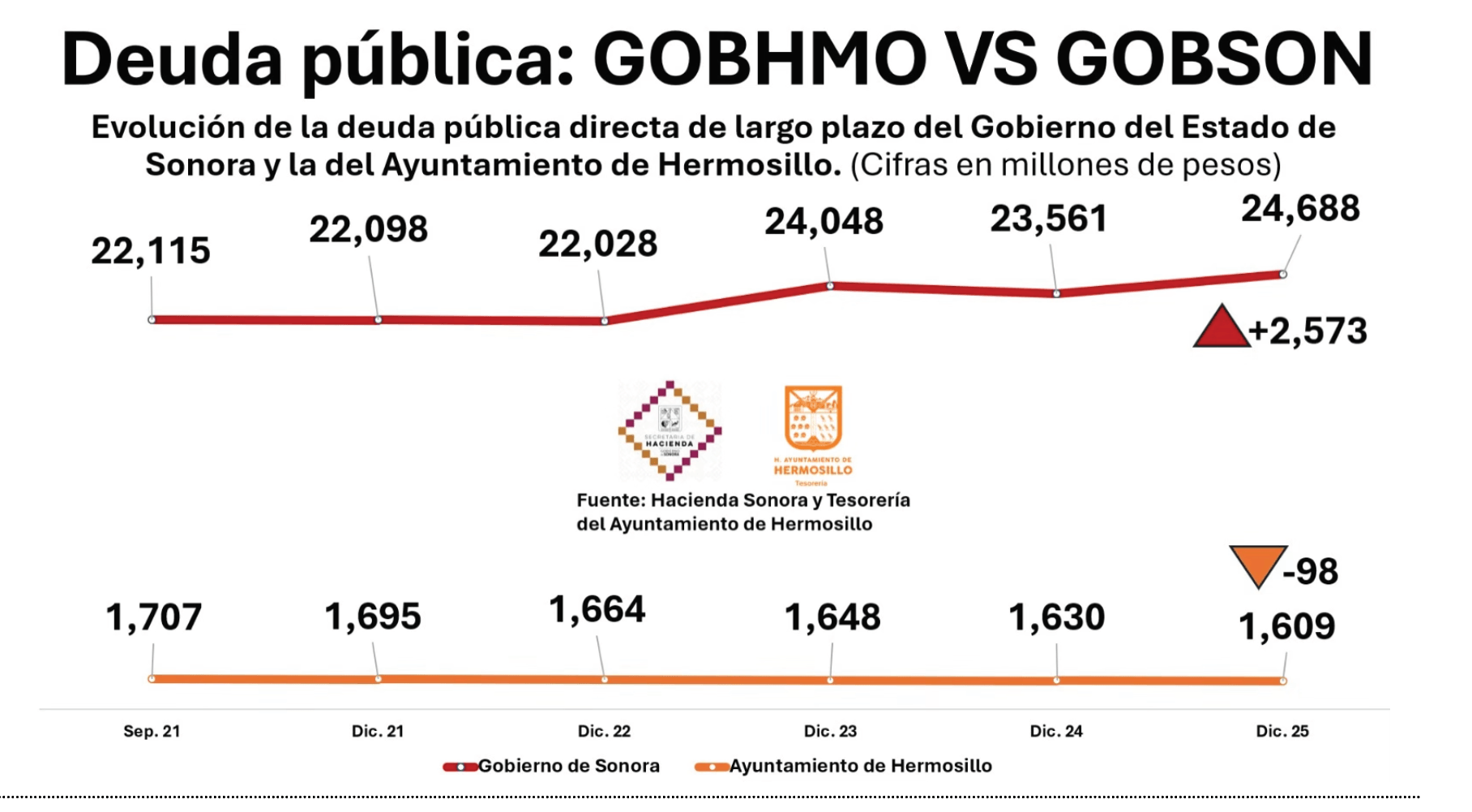 De acuerdo con estadísticas de la Secretaría de Hacienda de Sonora y de la Tesorería municipal, la deuda pública del Gobierno sonorense ha pasado de 22 mil 115 millones de pesos, en septiembre del 2021, a 24 mil 688 millones en diciembre del 2025 para un crecimiento del 11.6 por ciento.